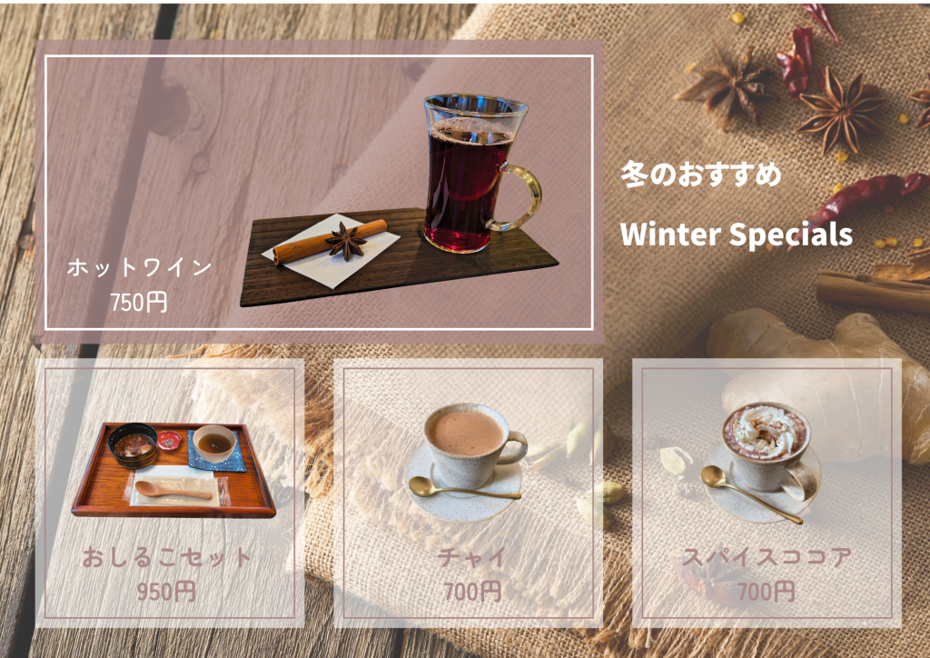 スパイスの香りとやさしい甘さが、冷えた身体にじんわりとしみわたるホットワイン。